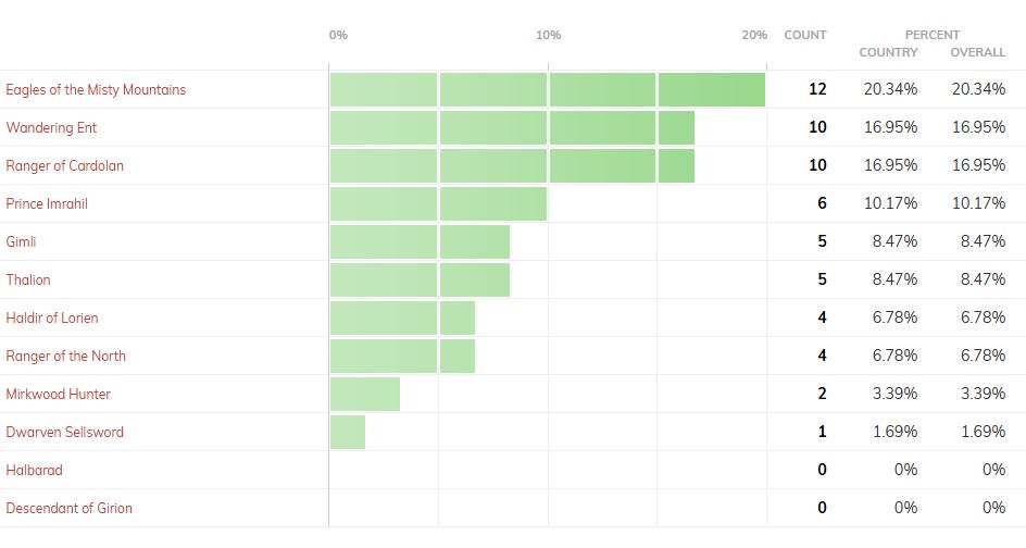 The Descendant of Girion is the newest card on this list, and hasn’t been officially released yet. I hope to see him get some plays in the future as well, so that a follow-up poll might see him higher on the list. For now, he has to stay on the bottom of the poll, with 0 votes. Newer allies do well in this poll however, as both Thalion and Mirkwood Hunter received some votes. Thalion even got to a shared 5th place with Gimli!