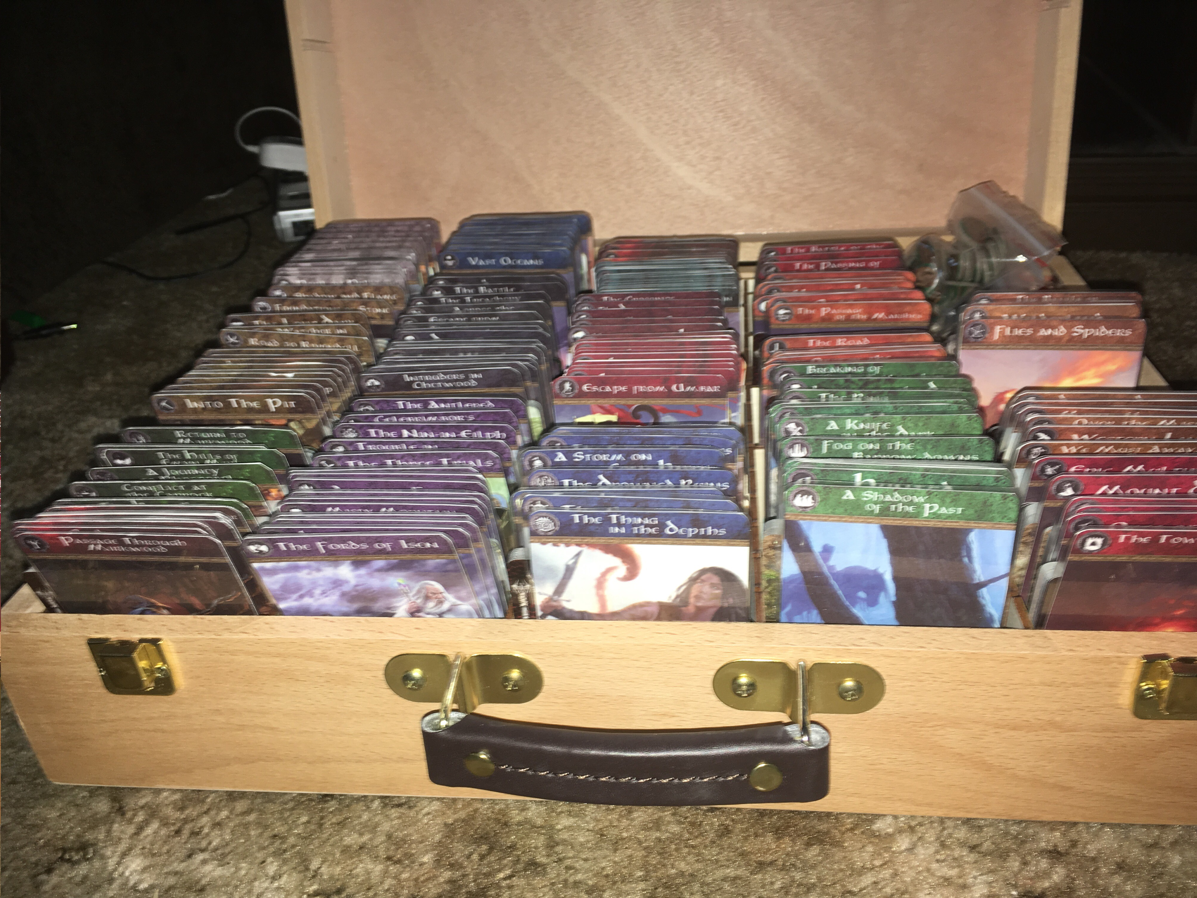 I currently own all of the content for the game that includes player cards (so every deluxe, adventure pack, and saga expansion) as well as two of the print-on-demand scenarios. I don’t intend to purchase Nightmare decks or more POD quests anytime soon, but if I ever get to that point I would have to rework the storage a fair bit, since it is already at near capacity with what I have.
