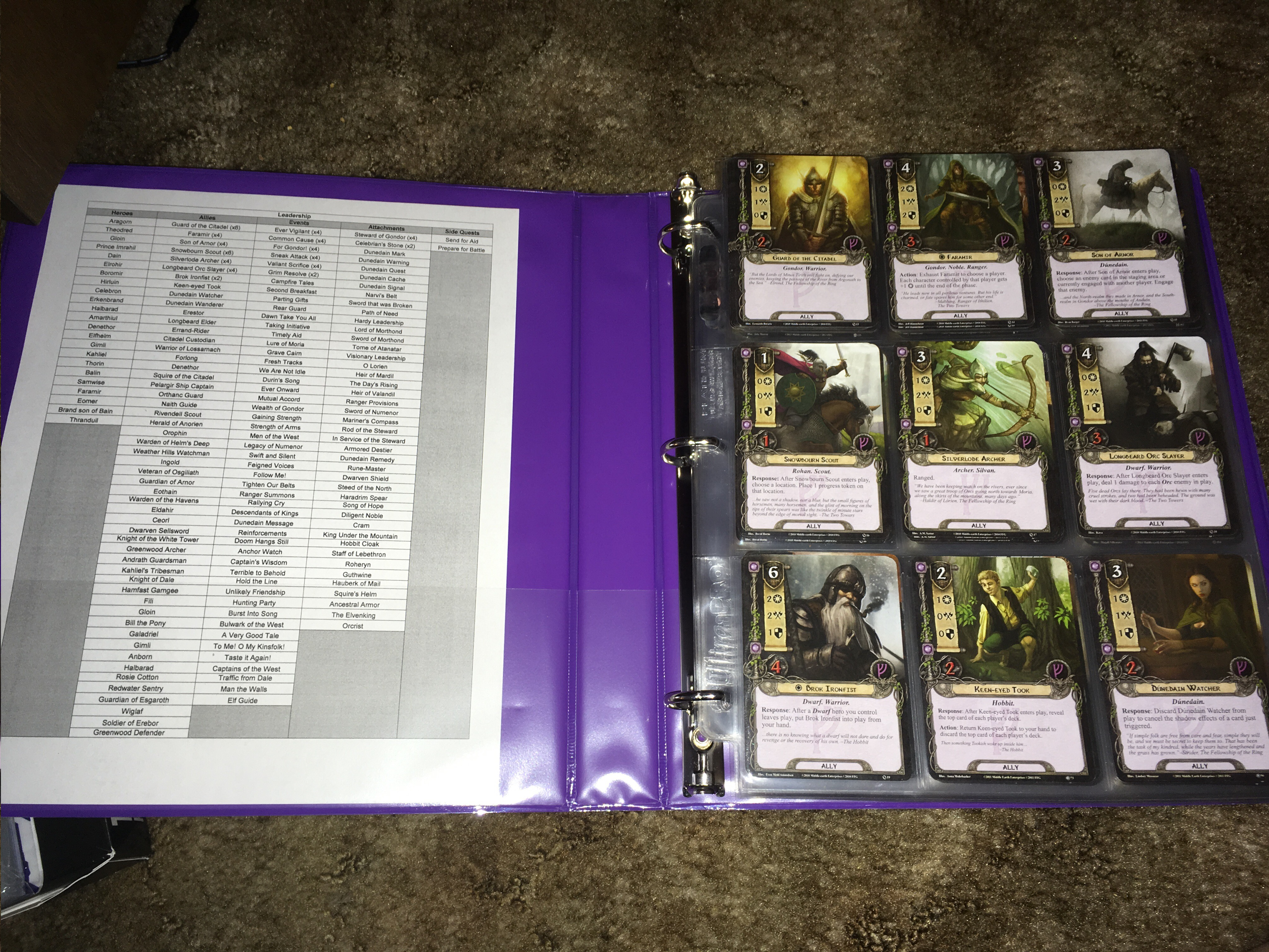 I don’t keep any of my player cards sleeved, so they all fit into binders fairly well when they aren’t in use in decks. I have six binders in different colours, one for each sphere and then a white binder that stores all of my heroes. The binders are just standard 1-inch three ring binders that I purchased from Target, I think they were around $2 each. I use Ultra-Pro pages and sort the cards in each binder by type, and then in order of release. I am currently playing through the game progression style to learn all of the cards and quests, so this works well for me. I have a print out in each binder that lists the order of cards so that I can more quickly find a card if I can’t remember exactly when it was released.