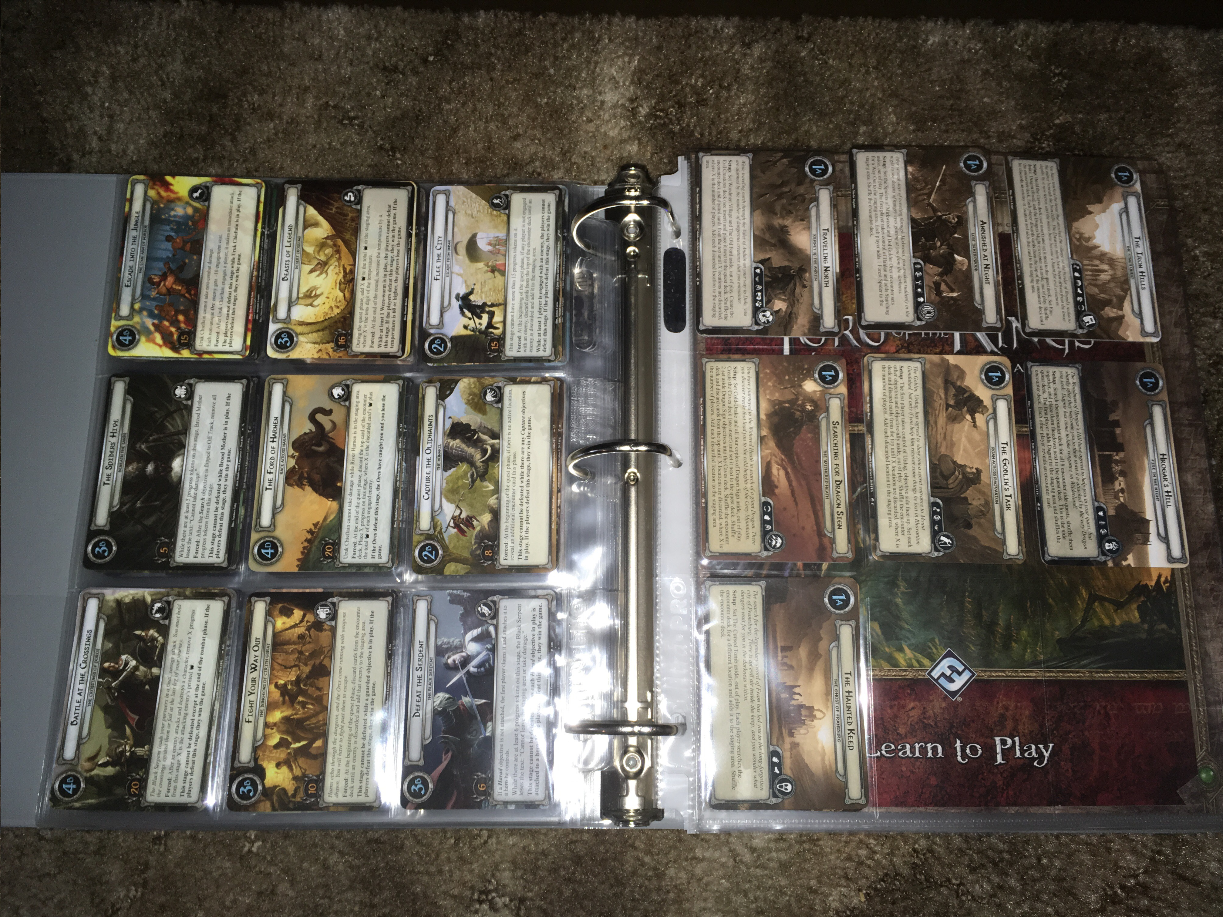 Much like my player cards, these are all stored unsleeved. I have a large 3-inch binder where I store all of the quest cards as well as all of the rule sheets for each scenario. It has gotten a little bit difficult to use as my card pool has expanded, but it really cuts down on space that those reference pages and rule books can take up. I have a separate 1-inch binder than is for the Saga expansions, storing the quests, rules, boons, burdens, treasures, and saga specific player cards.