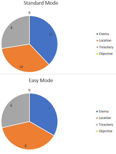 As can be seen in the pie chart, there is a roughly equal spread of card types in the encounter deck. This makes guessing with Wingfoot a bit tricky, but in higher player counts, you are bound to reveal one of each type each round. The statistics above do not take into account the unique cards set aside at the beginning of the game, and also don’t include the Cave Torch.