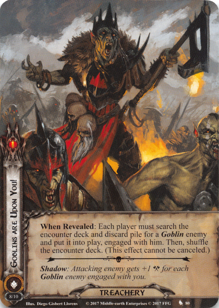 - Goblins are upon you! forces each player to search the encounter deck and discard pile for a goblin enemy, and put it into play engaged with him/her. This effect cannot be cancelled, so there is no easy way around it. For an in-depth discussion on what enemies to pick, see the discussion of quest card 2. As a shadow card, this card grants +1 attack per goblin enemy engaged with you, which hopefully should not be too many. If you are getting overrun, this might be the card that seals your defeat.
