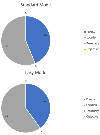 These statistics do not include any of the locations, as they will never enter the encounter deck or discard pile. The Temple Guardian and all objectives are also not included for the same reason. As can be seen in the pie chart, there are no other locations in the encounter deck, making this scenario worthless for cards like The Hidden Way.