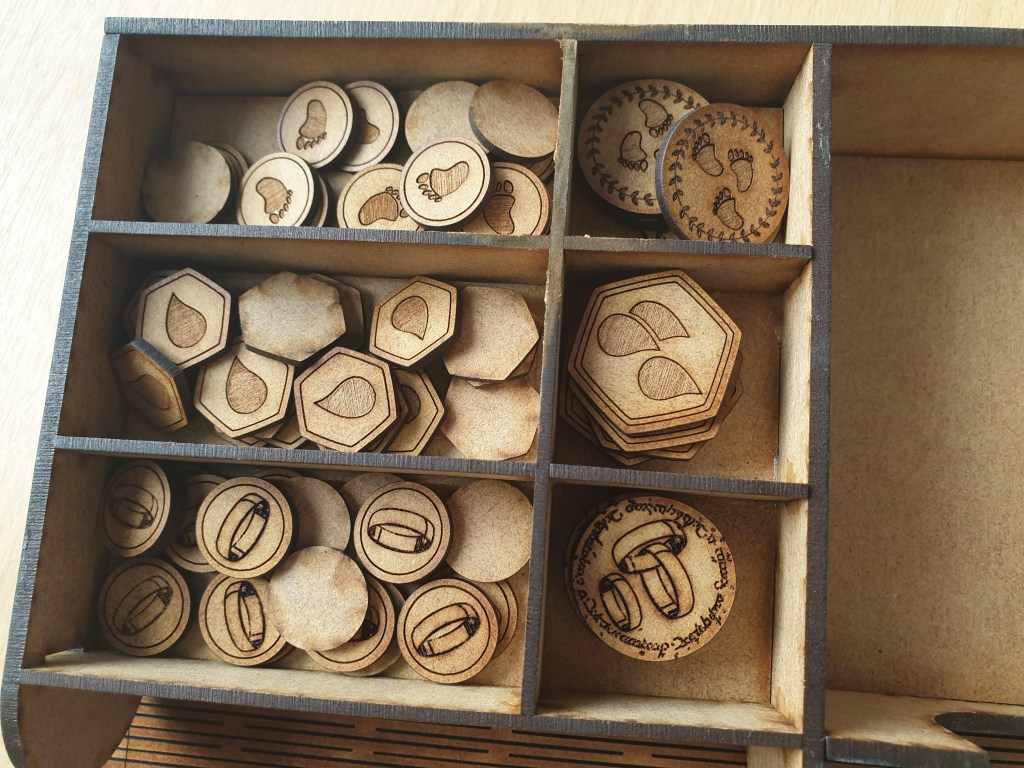 The remaining two thirds has two levels. The top level is further compartmentalised to hold custom MDF tokens. I opted for The One Ring icons to depict resource tokens, drops of blood for wounds, and kept with the feet for progress. Then for convenience there are also 3x tokens of each variety.