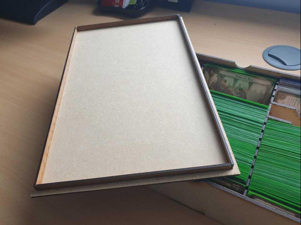 For the last few years I’ve been storing all my player cards inside the original box using the Broken Token insert, which has proved a neat and elegant storage solution and meant I could still enjoy the box art. The encounter cards were stored in their cycles inside pretty cheap generic cardboard deck boxes. This wasn’t so neat, as a full cycle is a very tight fit and left no ‘flip’ room or space for dividers but in the absence of anything else I just put up with it.