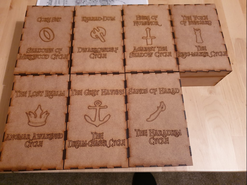 This is still a work in progress, however. So far I only have encounter card boxes for all 7 cycles up to Haradrim. We need to sit down and design storage for all the saga boxes, the neutral player cards and also have a think about nightmare decks, which is a nightmare in itself!