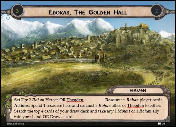 My first deck was a Spirit/Leadership that fully embraced Rohan cards with Eowyn, Dunhere and Theodred and a huge army of allies. Starting attachments were Song of Kings on Eowyn, Song of Battle on Dunhere (there are NO good Spirit attachments in the available card pool and I had put in 2 Horseback Archer Tactics allies), and Dunedain Mark on Theodred. For the fun of it, I used Edoras as a Haven (thinking I could also put Gleowine in my deck and use the Haven resources to pay for him. My starting Threat (including Edoras) was 27.