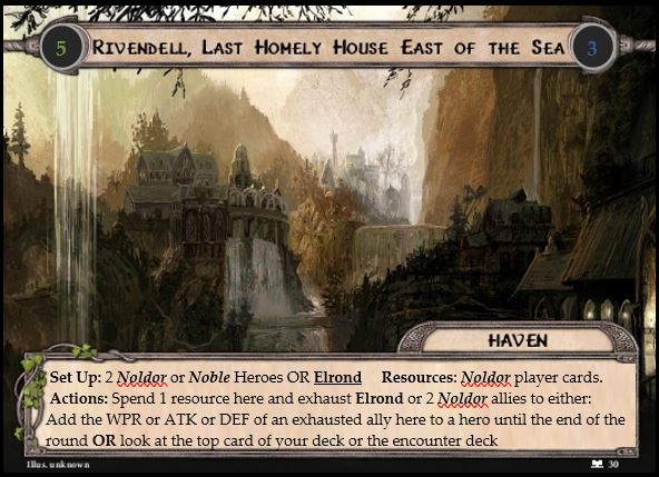 For variety, I totally changed my deck and had Legolas and Glorfindel join up with Beravor for a Tactics/Lore deck this time. For starting attachments I put Blade of Gondolin on Legolas as my questing power was now lower, Song of Kings on Beravor and Song of Travel on Glorfindel. Having the Songs made sure that I could have really thematic cards from all 4 Spheres. Since I have Legolas, I can test my ‘Ranged’ mod for solo play and also use Rivendell as my Haven, although this meant my starting Threat is 34! I didn’t use the Dol Guldur stronghold.