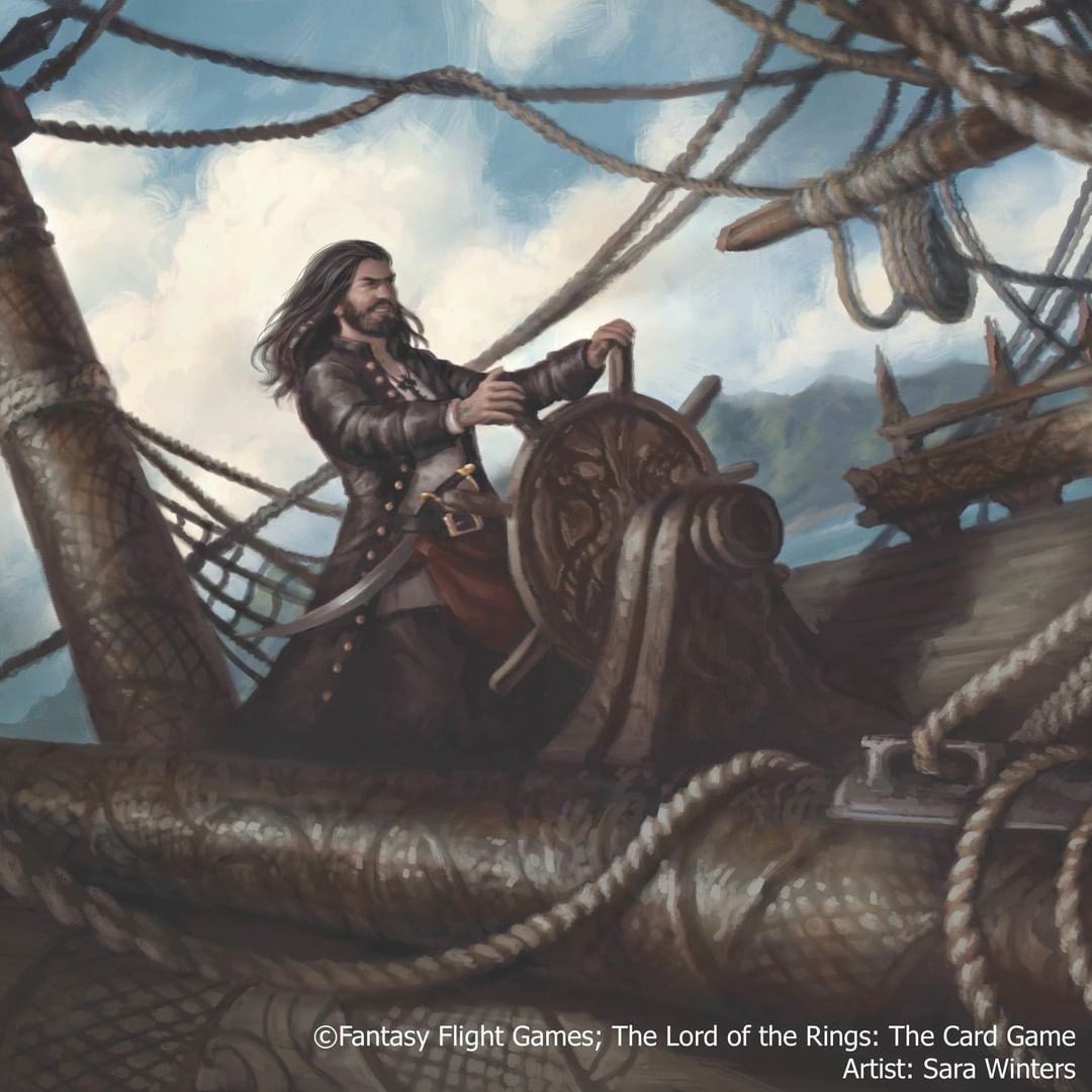 • Corsair Seafarer: Corsairs just love those resources, don’t they? This enemy continues the trend, with an ability that steals resources from engaged heroes whenever they commit to the sailing test or to the quest. This can be troublesome for lineups that require their heroes to quest, but combat orientated decks are better suited against this enemy. The Seafarer only steals from heroes with actual resources in their card pool, a bit like the Woses in Druadan Forest. The resources boost the Seafarer’s attack only, with +1 attack per resource on him. This is on top of his stat line of 2/2/2/3, which is decent, but can be overcome by players with ease. The problem you will encounter is when this enemy starts obtaining multiple resources per round, making his attack a big problem. In order to avoid this, you can adopt several strategies. First, you can make sure that you have no resources remaining on your sailing or questing heroes. This can be done by either spending resources on cards, or moving them to your attackers/defenders. Second, you can hold back your heroes from the sailing test or the quest. This is easier if you aren’t the first player and are in the later stages of the game, where your allies can carry the load. Third, you can try to kill the Seafarer quickly, before the next quest phase. He only has 3 hitpoints and 2 points of defence, so you only ever need 5 attack to get rid of this guy.