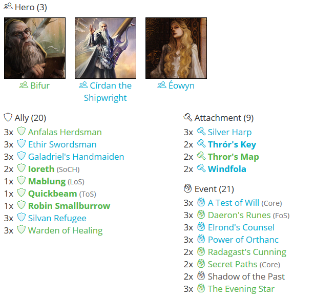 The second point he mentions is that a Rossiel Deck is easy to set up. I first wanted to go this route, but when I was double checking the rules, I saw I played this quest wrong all the time: I always thought the Hinder keywords means that enemies deal not damage when attacking but remove that number of progress from the quest, but in fact they don’t attack and you remove one damage per engaged enemy. That way, using Rossiel as a quester and defender is irrelevant and I build the deck even more focused on willpower, starting with the only 4 Willpower heroes that can quest without an attachment: Cirdan and Eowyn. I decided to go with both spirit versions, because that way I can easily play this 2 Cost/2 Willpower allies. Our last hero will be Bifur to play the Lore questing allies as well.