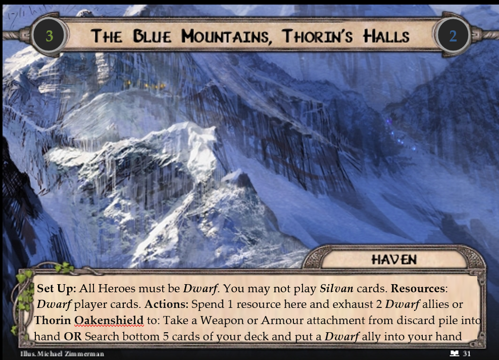 | Thorin’s Halls Resources: 3 Threat: 2. Set Up: All Heroes must be Dwarf. You may not play Silvan cards. Resources: Dwarf player cards. Actions: Spend 1 resource here and exhaust 2Dwarf allies or Thorin Oakenshield to either Add a Weapon or Armour attachment from discard pile to your hand OR Search the bottom 5 cards of your deck for a Dwarf ally and add it to your hand. |