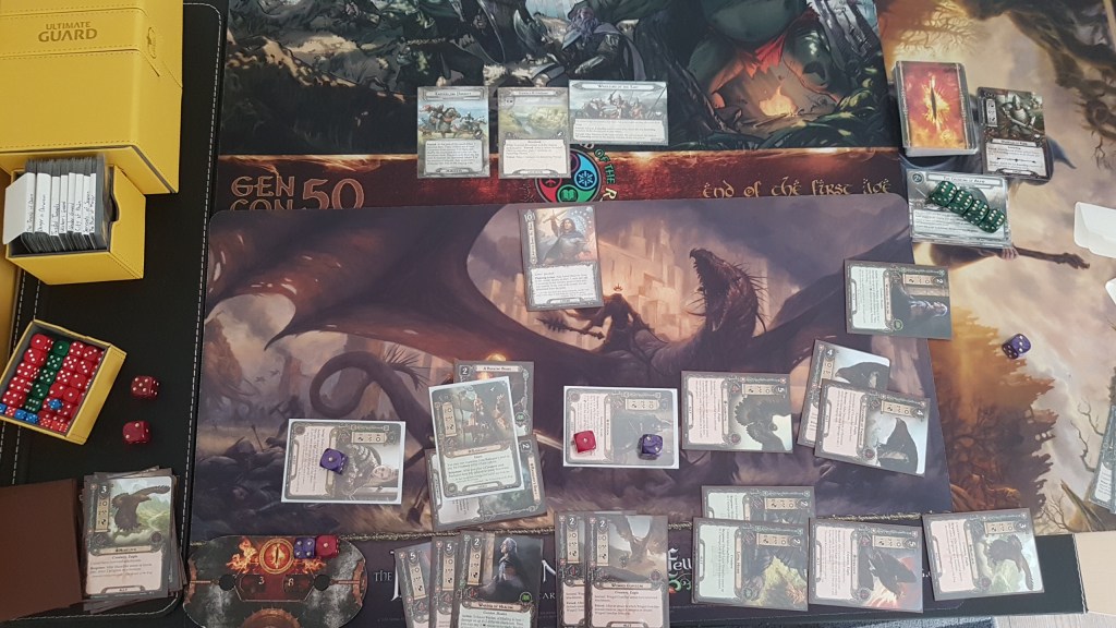 The quest is somewhat inspired by Mount Gundabad, but has a real sense of urgency with the ritual mechanic. You will get a free planning phase at the start that you should take maximum advantage of. Try to get your engine going as quickly as possible, so that you can go through these different quest stage quickly as well. The Easterling enemies in this scenario work like the ones in the River Running scenario, with different attachments making them stronger. I beat this scenario during my first run, but that was mostly due to luck with the order of cards I revealed and the high cost cards in my hand that allowed me to pass one stage in one turn.