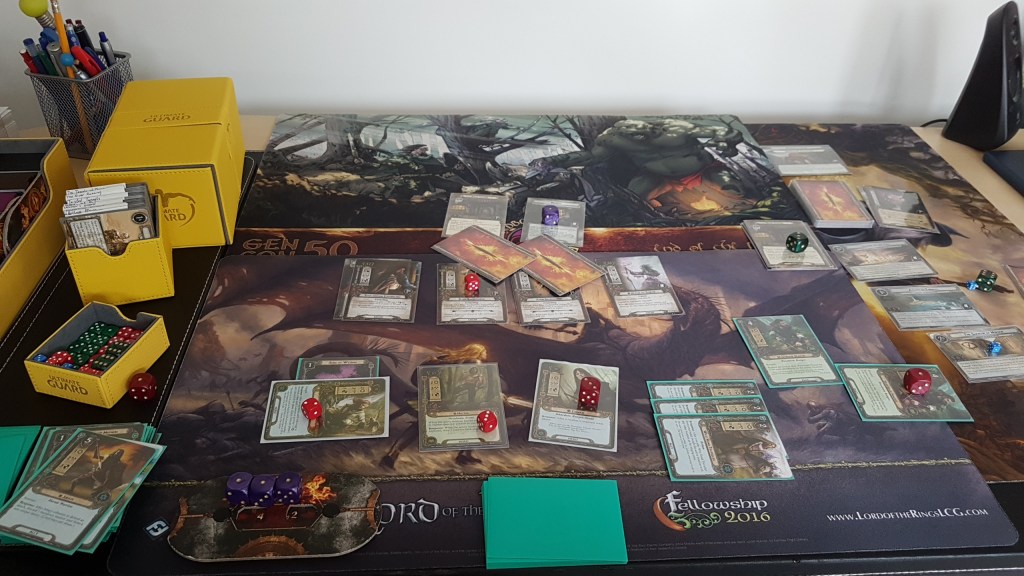 I love how this game throws in some pop-culture references here and there in titles of their cards. Much like the first quest card of the Mumakil and the entire Beneath the Sands scenario. With that said, it is the only happy memory you’ll have of this quest, because it can be a punishing one. The quest works with a timer where the enemies within are summoning the power of Mordor. Every turn (or multiple times per turn) a token will appear on a side-quest in the staging area. For every 4 tokens there, a card from the Power of Mordor encounter set gets added to the staging area. These come with additional rules, such as a lower threat elimination cost, or protection for the enemies that just engaged you. There is also a Nazgul enemy and punishment for card draw. It is vital that you work through this quest fast, before the ritual is complete and all of the Power of Mordor cards are in play, as the next ritual would mean that you lose the scenario. This puts pressure on you, and will make the quest harder as you go on. It also means that your performance depends on what Power of Mordor cards are revealed at what point in the game. If your location control is on point but Khamul the Easterling engages you, it will be a very different game than if the Tower of Barad-Dur was revealed instead.
