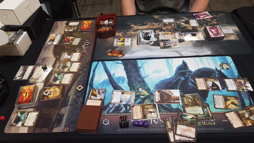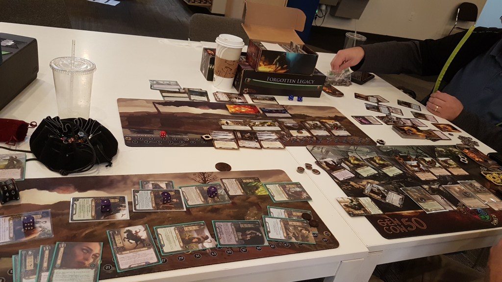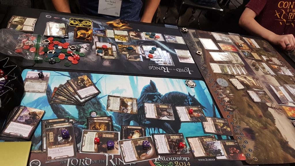 To round out the day, the con organizers had decided to add Siege of Annuminas to the board. It was my first time playing an epic multiplayer quest, since I don’t have a playgroup large enough to play it that way (unless I go 12 handed…). We lost, but that wasn’t due to our group, who played a mono-Lore fellowship that kept a tight lid on the encounter deck. Victory Display, healing, traps, and many more tricks meant that the enemies stood no chance against us once we got set up. However, the other teams got overwhelmed by enemies and Annuminas got destroyed.