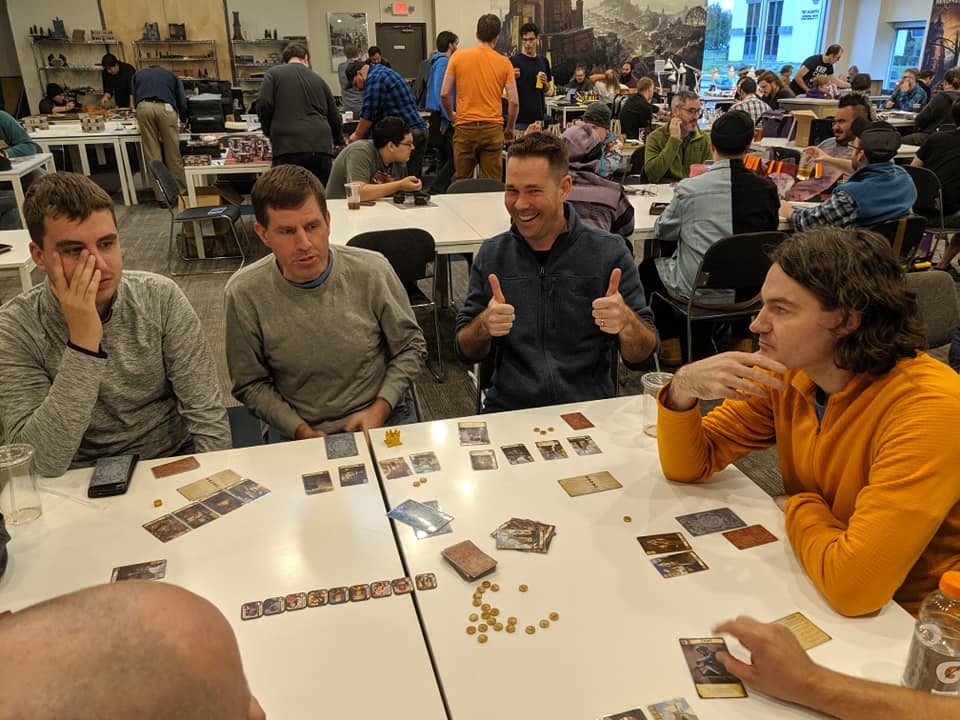 I went to sit at a different table afterwards and tried for an achievement by playing with 4 people with different badge icons. My axe was pretty rare, so I was pulled at all day for some games with people trying to get that achievement. I sat down with Vardaen, Phil, and Edmund for 2 games, one Weather-Hills, and one Intruders in Chetwood, which we both unfortunately lost. Those quests are just terrible to attempt in 4 player, since they scale pretty hard with locations and side-quests. But the games were still fun, and despite not winning, I did see some more of my decks in play.