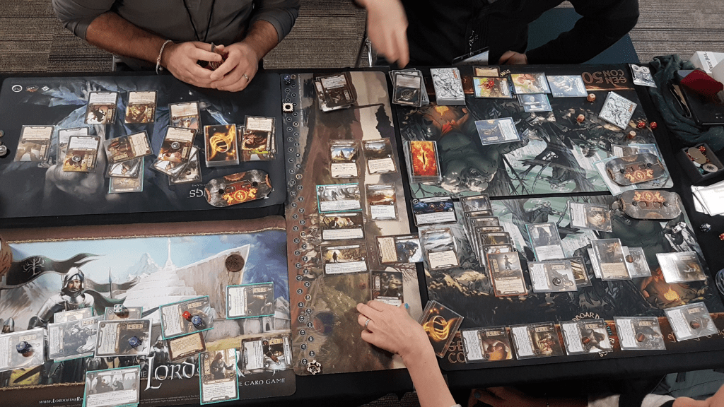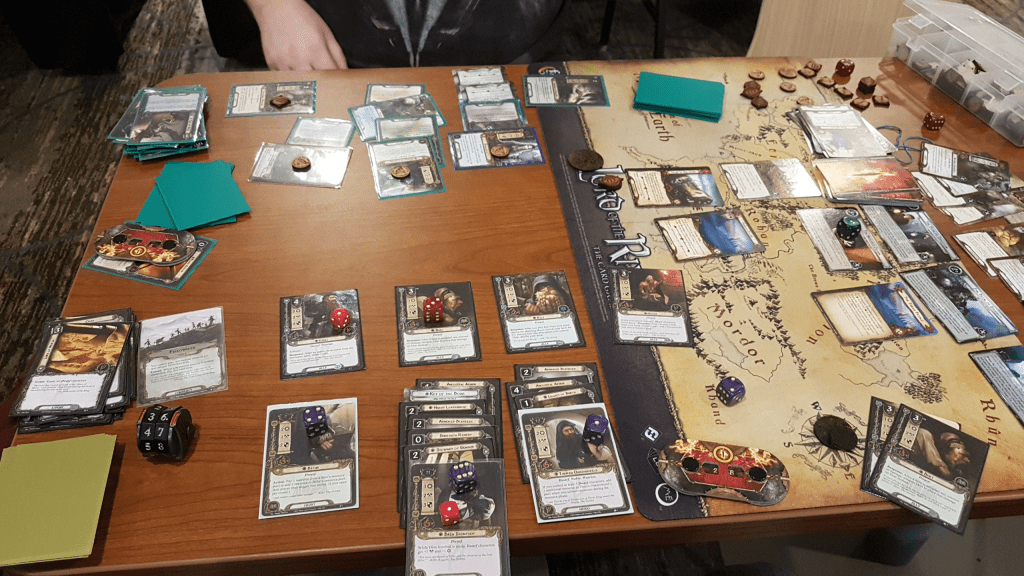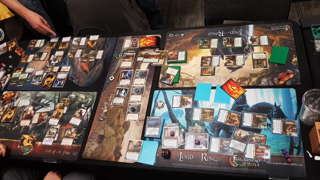 After getting some dinner (or midnight snack, depending on your timezone), I sat down with the folks from Card Talk. I had been in contact with them for a while and was excited to finally get a game in with them. We settled on Treachery of Rhudaur, which was also one of the extraveganza quests of Friday. But a 4 player game of Rhudaur isn’t easy. We tried to go for the achievement of getting all 3 side-quests cleared in the first stage, but we were just a few points of progress short of clearing the third quest. We also got side-tracked with Seal the Tomb, so we had to take care of that first. Nevertheless, we powered on through, and with a little help of me playing Light the Beacons (gotta play those weird cards at conventions right?) we successfully defeated Thaurdir and won the quest. It was my first time playing the Caldara-Lothiriel-Cirdan deck, but I was very happy with the results. I quested hard enough, and managed to help out with combat through Narya and Jubayr.