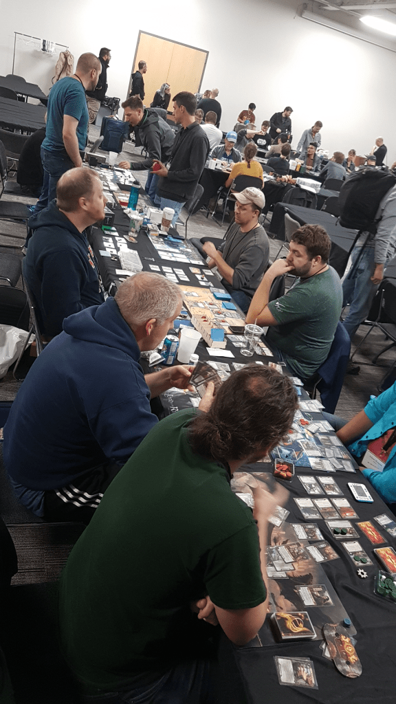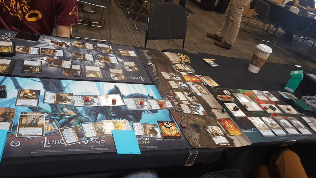 Finally the Con was upon us, and the first day had begun early. While everybody at the Flophouse was still getting their breakfast fixed, the organizers assembled at the Con to get things ready. We soon followed and picked up our badges and our t-shirts when we arrived a little past 9 am. I sat down with a couple of people I drove in with, including Attrick, Secondhand Took, and bigfomlof. We sat down for a 4p game of Across the Ettenmoors again, which was one of the many quests available for prices that day. We lost our first game thanks to an unfortunate combo of surging cards and side-quests preventing us from playing cards. We reset and got our victory shortly afterwards with a 4p victory over the quest. We also got the first achievement of that quest, which was met if you never travelled to a Safe location. Questing hard and relying on Took’s mono-Lore deck to do some trickery carried us to victory with relative ease.