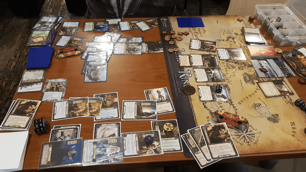 While not the longest day of the Con, this day would drag on a little longer than yesterday thanks to the off-site party that we were having during the evening. We started the day by going to the con and finding the doors closed again. This has become somewhat of a tradition now, since last year we had to wait in the snow for a few minutes before we could enter the center. It was still cold outside, but a large hot chocolate resolved that. The first of three games I played today was a 4 player game with BardLee and two new players (husband and wife I suppose) of Fate of Numenor. This quest is largely forgotten between the amazing quests in the cycle, but it is more of a guessing game. With 4 players, we got hit with a lot of treacheries that meant adding more Lost Island locations to the staging area, until we had all but one in the staging area, a total of 10 locations, and 3 non-Lost Island locations. This is where I performed an amazing move with Sulién and Narya to trigger her ability twice. This meant that none of the locations in play contributed any threat to the staging area, negating 23 threat by herself. But that wasn’t even the best part of the game. We ended up having to shuffle the Shrine location together with 9 other Lost Islands and we then had to pick a location at random. But lady luck must have smiled upon us, because with just a 10% chance, we pulled the Shire to Morgoth on our very first attempt! This led to a swift victory and the end of this fun quest.