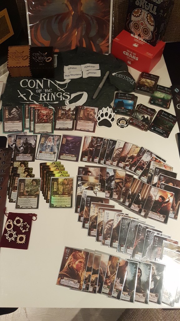 - Cardboard of the Rings 2019 swag (Encounter mat with 4 wooden rings to keep track of threat, willpower, archery, etc)