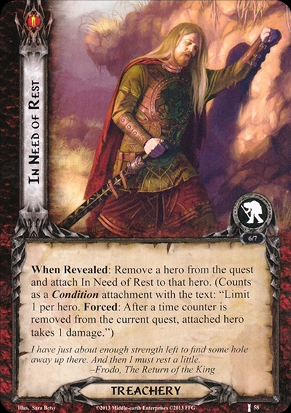Beside those Dunlendings, most of the other Encounters sets that reappear in this cycle are relatively generic and manageable. The one exception is the Weary Travellers deck. Low on Provisions and In Need of Rest are two horrible treacheries that deal a lot of direct damage. Especially for in Need of Rest you really have to be prepared, it will kill a hero if you don’t have healing, damage cancelation or condition removal and definetely gets my vote for the worst encounter card of the cycle. Otherwise the treacheries in this cycle are not to horrible for a solo player, so you can often get away with not playing A Test of Will. That is in fact one of the reasons I like this cycle much better then Dwarrowdelf or Against the Shadows and started this series at this point.