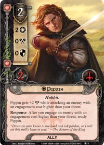 The Tactics sphere is however the really star here, having both aggresive combat (Beorn, Boromir, Imrahil) and Willpower (Theoden, Eowyn) heroes. With the new additions of Meneldor and Pippin (who was released during this series and managed to sneak into all 3 decks from then on) they have now some great questing allies, that can help them deal with even Location heavy scenarios like Celebrimors Secret or the Antlered Crown. And for the quest that needed the highest amounts of willpower, The Nin-in-Eilph, I only managed to win after switching to a mono-Tactics deck with 11 starting willpower.