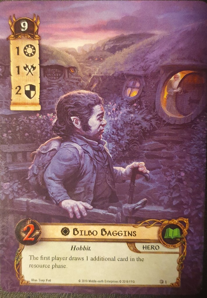 The most recent hero to this day is the alt art of Bilbo Baggins who was in the very first AP ever released. This version features Bilbo stepping out of Bag End and was released during GenCon 2019 along with the Bilbo-Smeagol playmat and the Mines of Moria scenario kit. This time, FFG was understocked on LOTR LCG product, as they didn’t even have the new Deluxe that was supposed to be there. As a result, there were far less alt art Bilbos released during the convention, so less are in circulation. Many people ended up with IOU slips from FFG, so after ahving gone through so many hoops, people ended up holding on to their copy of Bilbo. Balancing this with his low popularity though, gets you around the price of $60-$70 for his alt art. It is difficult to pinpoint, as I haven’t seen any copies for sale outside of the first 2 weeks after the convention. Should prices change, I will adjust the article accordingly.