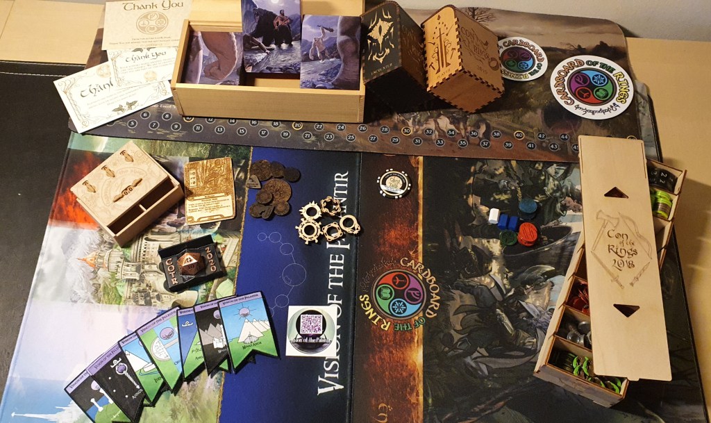 The previous two categories were the official collectables, but that is not all that can be collected for this game. Various content creators, such as Cardboard of the Rings, Con of the Rings, CardTalk, and Vision of the Palantir have their own loot that can be collected. These include items such as custom deckboxes, custom tokens, custom threat trackers, etc. These are almost never sold online, but can be won through give-aways, attending conventions, or subscribing to the creators via Patreon. These items are often very different than what is officially licenced by FFG, but improve gameplay in certain ways. Examples of this are stat buff tokens, or mats that keep track of threat/progress. For a list of the COTR loot, see this link. You can also check out this article for a list of what community outlets you can support to get swag!