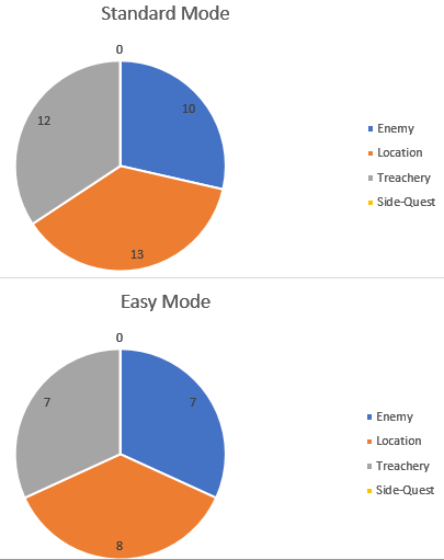 There seems to be a roughly equal distribution between encounter card types. However, remember that there are several effects that will add cards from the Evil Creatures deck. This skews the distribution more in favour of enemies. Locations will start to pile up thanks to the setup of the game and the many quest points some might have. The added restriction on progress while at stage 2 will cause these locations to remain a threat in the staging area for longer than might appear from the spread.