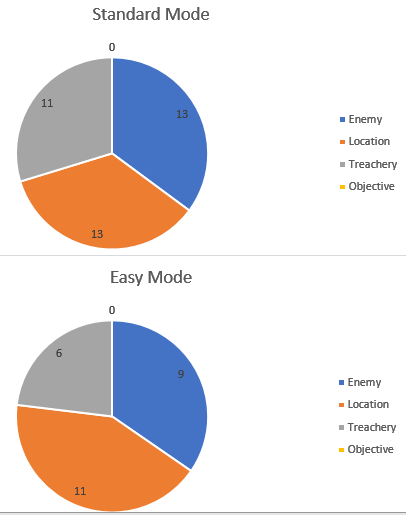 The statistics above do not count the Cold-Drake, Dragon Signs, or the Caves deck locations to the encounter deck. These cards never enter the encounter deck. From the statistics, you see that the encounter deck is quite well balanced between enemies and locations, which can cause the problem of location lock in higher player counts. Easy mode removes a lot of the treacheries from the encounter deck, skewing the balance more in favor of locations, making those a bigger problem. There are also a lot of immunities to remember, so keep an eye on those.