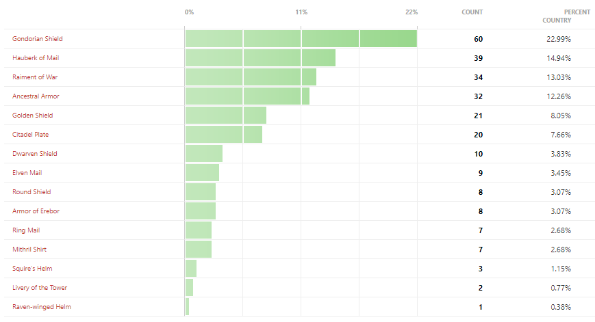From here on, there is a considerable drop in votes for the rest of the Armor attachments. That is likely because these attachments are usually trait-restricted or offer poor value compared to other attachments higher up on the list. What I did not expect though, is that the Raven-winged Helm would end up on the bottom of the list with just 1 vote. This attachment does not grant buffs to stats, but cancels damage that would be dealt to the attached hero. Sure, that hero has to have the Sentinel keyword, but the Helm is not restricted and offers healing without having to rely on Lore or on Honour Guards. I quite like the Helm, and no Beregond-tower is complete without it.