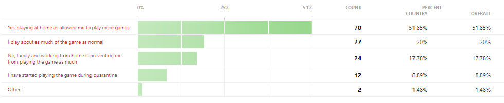 The second group of 20% of votes was for having about as much time for the game as usual. I feel like I fall into this catagory, as I have also started my job during this quarantine, and have found that I have less time for the game because of work. But getting to work from home counter-balances that, so I end up with about as many plays per month as I normally have. I think this is the case with many of the people that voted for this option as well. This also includes the people who stick to their gaming schedule and use their spare time for other hobbies. Other games and activities with the family has also been a factor to this.