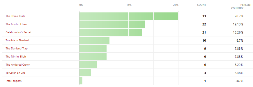 I was surprised that Nin-in-Eilph got 9 votes, meaning it was just 2 votes away from fourth place. Appearantly people quite like the quest, or were trolling the poll. The quest isn’t loved by many, since the quest cards require you to quest hard, or you have to reset the quest deck and start with a new restriction on your deck. It can be pretty tough to get through, though the enemies aren’t as bad. The quest does conclude with a big battle against a Watcher-style enemy, which not many people have fought, as it takes quite some time to get through. In my opinion the least favourite quest of the pack, but it seems 9 people disagree.