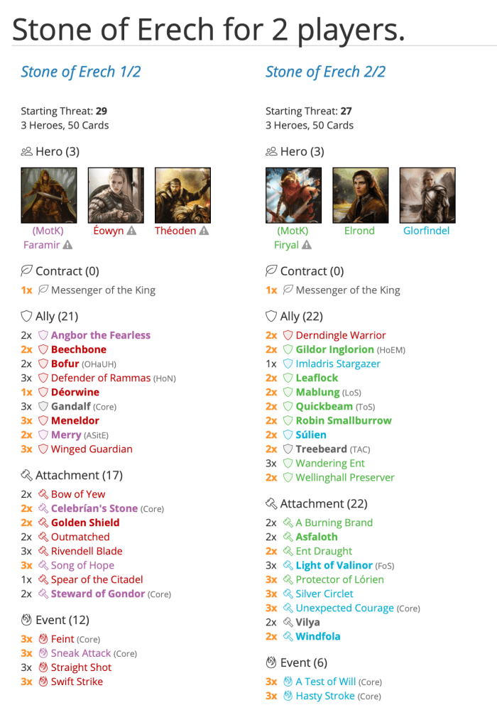 The decks are: https://ringsdb.com/fellowship/view/9286/stoneoferechfor2players