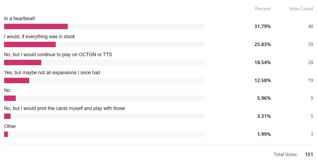 A quarter of the poll was filled in by people who would buy the game again if everything would be back in stock. Luckily, the early parts of the game have gotten a recent reprint. The first 2 cycles would definitely be easy to obtain again, after which people can easily expand their collection again. However, we are still missing a few critical expansions that are much sought after. If those would be easy to obtain, a lot of people would jump back on the game.