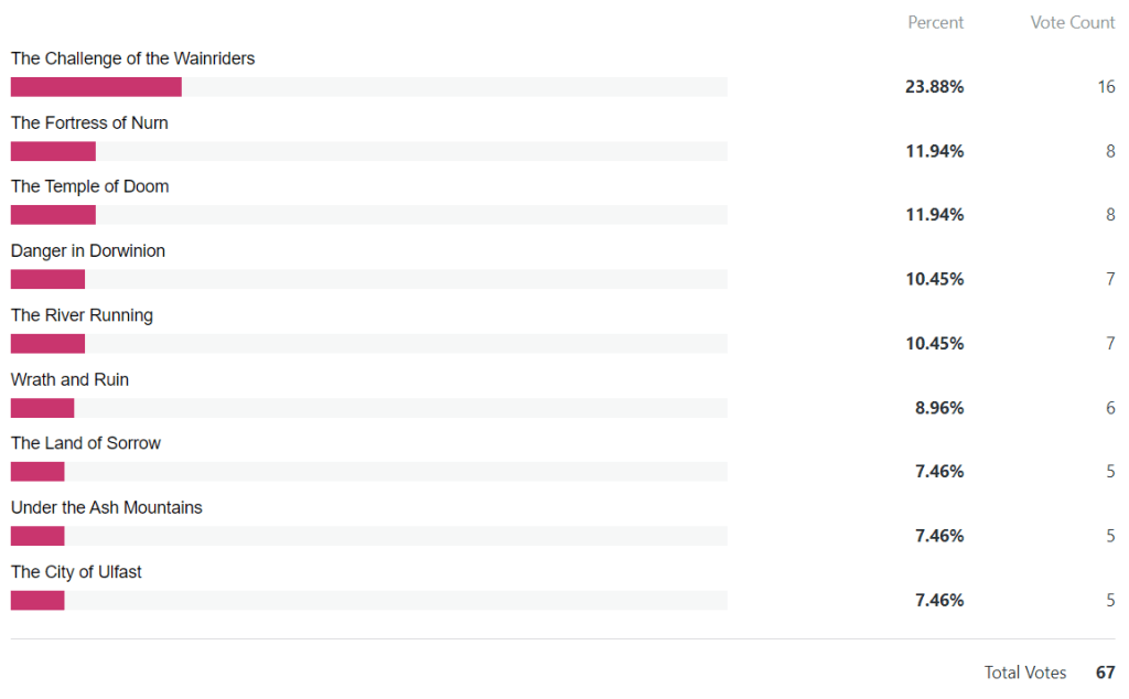 The rest of the quests are just too close together to really compare, and all of them received at least 5 votes. This goes to show that the design of all the quests in this cycle is appreciated by the community and while the quests are very different, none are collectively referred to as the worst. My pick for the worst quest would go to Under the Ash Mountains, but maybe that is just a personal thing. There were still 5 of you that picked the quest over others.