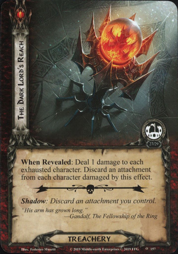 But the biggest problem here is The Dark Lord’s Reach, dealing damage to exhausted characters (and discard attachments, but this normally isn’t a problem because your heroes with attachments should be ready). If you can’t find your healing pieces or Test of Wills, it will ruin your game rather quickly, especially since Frodo only has 2 hitpoints. On my 27 turns game, I was lucky to draw both my Wardens of Healing, so I could sack one to Lethal Counterattack, and the other could keep me from not dying. During my lost game, I lost Frodo at my third quest stage, and with Under the Watchful Eye in play, I had to race to stage 2. But because of that, I wasn’t prepared for the final battle and ended up being killed by Ulchor and multiple other enemies.