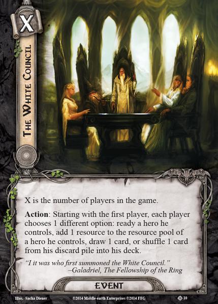 The events are our usual staples, A Test of Will is a key against those horrible treacheries, Elrond’s Counsel can work before you take Covered in Darkness to buy some time, and while Feint doesn’t work against Ulchor and Khamul, it’s still really good against the Olog-Hais and Soldiers of Nurn. Sneak Attack+ Gandalf isn’t as strong as usual because it costs Frodo’s resources again, and the effects are limited. You can’t draw cards from an empty deck, Covered in Darkness will prevent the threat reduction, The Armies of Mordor stops you from bombing an enemy you engaged that round, and the damage can’t be put on the unique enemies either. Still, there will be use-cases, and sometimes it’s just worth it to sneak another blocker or attacker in. The White Council is the card that really shines here more than usual. Reshuffling A Test of Will in an empty deck feels just too good, but I also made use of the readying effect to ready a defender or attacker in a pinch.
