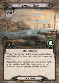Pelargir Quay: With this cycle, we finally had a switch in Location types as we got to explore City Locations like the markets and taverns of Pelargir and Minas Tirith, which made a refreshing change from endless forests, hills, and mines. This Tour Location is another example of the Tour allowing players to visit Saga Locations without playing Saga Quests as Pelargir is visited in ‘The Siege of Gondor’ Quest in ‘The Flame of the West’ Saga box. But both effects on the card are much more pleasant for the players, allowing a resource reduction of a few allies plus a chance to spend some of those saved resources on cargo brought into the port city by the ships at the quay.