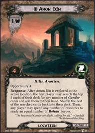 Amon Din: We wanted to add this Location as ‘Amon Din’ doesn’t appear in ‘Encounter at Amon Din’! As it was perhaps the oldest of the beacon hills, originally used as a fortified outpost of Minas Tirith, this Tour Location plays on the relationship between Gondor and Rohan, allowing the forces of Gondor to muster and players an opportunity to possibly gain some allies or nice events. If you have enough resources, the heroes of Rohan can also come to their aid. The relatively high quest point total is because Amon Din is atop a tall hill, although this does grant a slightly longer Opportunity window too.