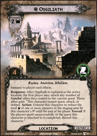 Osgiliath: This was another really difficult Tour Location to design as the ‘Assault on Osgiliath’ Quest is again so specifically a huge battle rather than a Quest where characters move normally between Locations. We decided on a more generic Tour Location and one that again can’t be used in this Quest but can be used in other Quests in the ‘Against the Shadow‘ cycle. As such, it’s not an actual ‘Osgiliath’ Location but one that is similar to ‘Cair Andros’ above. This Tour Location rewards a player that leaves Allies at the ruined city, which is at such a strategic position in Gondor, which will help to reduce the threat in the staging area.