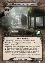 Monument of the Moon: This was a REALLY hard Location to design – how do you make a ‘nice’ Location for a Quest set in the Morgul Vale? The design sees a relic from a bygone age, where Minas Morgul was called Minas Ithil or ‘Tower of the Rising Moon’ before being taken by the Witch-King. As such, it has a very short Opportunity window (the clouds will cover the Moon very quickly in Mordor), but it might push back the hordes of darkness and reminds Noldor characters of that more beautiful time. If you are playing ‘The Morgul Vale’ Quest, it also might just stop Faramir from being toast by removing some progress tokens from ‘To the Tower’ too…