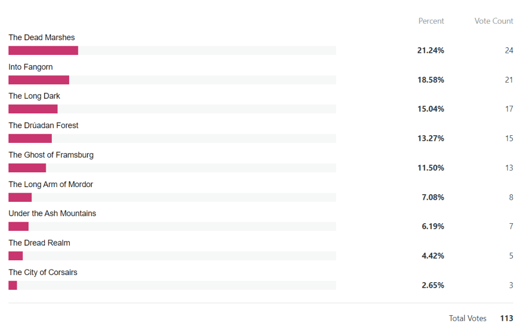 It sort of makes sense that the top 4 spots are occupied by the quests from the first 4 cycles of the game. These quests have seen the most plays over the years, and people with incomplete collections tend to at least have played these quests. The top spot going to The Dead Marshes is no surprise either. This quest can be pretty infuriating if you lose Gollum and have to spend 20 rounds having to find him. This is fixed in the Nightmare version a little, but not everyone owns the Nightmare pack or is brave enough to attempt it. This quest stands out to the sub-par game design of the first cycle, but we are fortunate enough to have only gotten better and better quests since. If the worst quest of the game is over 9 years old, then the developers have done something right since then!
