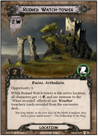 Ruined Watch-Tower: This Location already exists as a Nightmare version, but this Tour Location version is, as always, much nicer for players. It has the standard Opportunity window and is another simple, generic Location that picks up on the history of the Dunedain, their protection of Arthedain, and can be used in several Quests featured in the Region. Whilst players are at the Watch-Tower, they are protected from nasty Weather effects, which is very handy and appropriate to this particular quest. In a direct reflection of the Nightmare version, characters, rather than enemies, gain a Defence bonus.