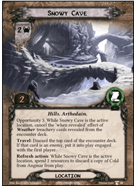 Snowy Cave: This Tour Location is a reshaped version of an older Tour Location – the ‘Mountain Cave’ from the Dwarrowdelf cycle. As such, it allows a respite from the nasty Weather conditions of the wastes of the freezing Eriador. It has more Threat than its counterpart but fewer Quest points and a longer Opportunity window to get to it. But again, players don’t know how far the cave goes back and if it is already occupied. As usual, the artwork is brilliant, but this remains a personal favorite of mine from the entire Tour.