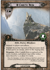 Cameth Brin: ‘Treachery of Rhudaur’ is a very focused Quest where players search the lost ruins of an ancient keep. So it was very difficult to design a ‘nice ‘ Location that fits with the theme of a creepy castle that is inhabited by undead! So The Tour has again gone for a Location that can be used in other Quests in the Rhudaur Region instead. This Location is a throwback to MECCG and even MERP (for those of you with long memories) and is actually not that nice at all! Higher Threat than normal Tour Locations, a possibly unknown danger, but also some possible rewards await if the players explore the ‘twisted hill’ of Cameth Brin…