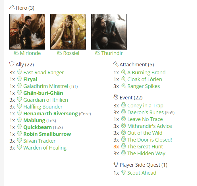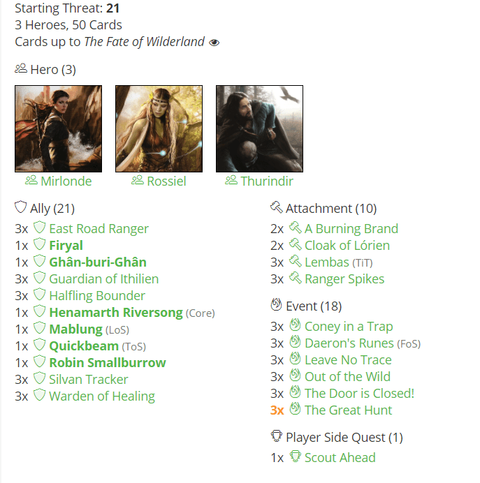 Wanting to ad three copies of both these cards, I had to make six spaces to stay at 50 cards. The cards I took out were two copies of Leave no Trace and three Lembas. While setting up Rossiel to quest and defend is nice, it’s not really needed and doesn’t help early on. The healing from Lembas also doesn’t make such a difference between the huge amount of damage dealt by the encounter deck and my Silvan Trackers and Wardens of Healing. If I can get them out, I’m fine, and otherwise, 3 points of damage won’t make the difference. I also cut one Cloak of Lorien and Burning Brand cause they are only needed late game, and added a Galadhrim Minstrel as my final card cause I have a lot of different events. Here’s a picture of the decklist with all the changes, and I’ll name it The Great Troll-Hunt.