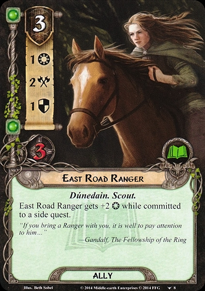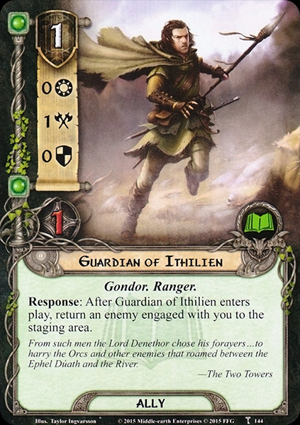 Speaking about encounter sidequests, I included East Road Ranger and Halfling Bounder to take advantage of them. East Road Rangers are especially useful on stage 1 where we have to explore sidequests to advance, and Halfling Bounders‘ ability will be active early, and cancelling an Arador’s Bane can save us from being attacked in the early game. A similar role has the Guardian of Ithilien, who can return an enemy we’re forced to engage to the staging area, and if we still end up with a high attack Troll or Giant, he’s a cheap target to throw under the bus. The other allies are the usual efficient Lore questers, and with Warden of Healing, the best healing card in the game.