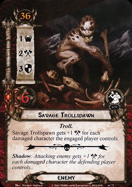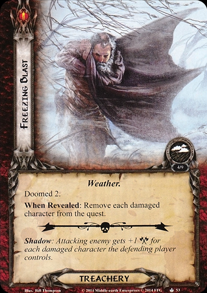 With all these tricks available, I felt pretty comfortable to defeat this quest… and lost my first run on stage 2. There were a couple of unlucky things coming together. I had to start against Forage for Food that deals damage to heroes when they spend a resource, and in combination with 2 copies of Biting Wind damage piled up on my characters quicker than I could heal it. This would have been fine on its own, but on stage 2 the encounter wrecked me. I quested against Lie Low when I revealed a Freezing blast. I didn’t make progress with most characters removed from the quest, so all enemies got -20 engagement cost. Two Savage Trollspawns swinging for 6 attack were way too much for me to handle at this point, so I had to scoop.