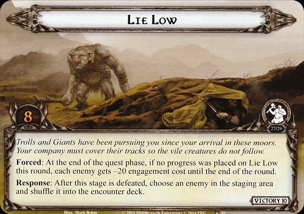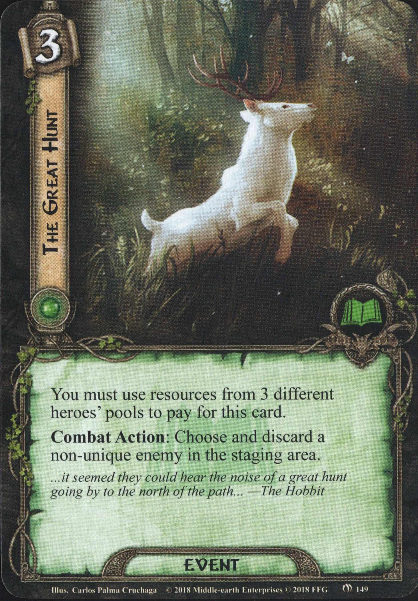 However, there are also other ways to deal with enemies. None of them is immune to attachments so that Ranger Spikes can trap anything permanently. Coney in a Trap takes advantage of Amarthiuls Warrior trait to cancel an attack, but the biggest one is The Great Hunt, which can get rid of even the biggest Troll or Giant and makes a mono-Lore deck worth playing.