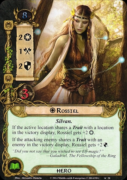The events and attachments are mainly here to set up Rossiel. Once we get a Troll enemy in the Victory Display with Out of the Wild, attach a Cloak of Lorien and Burning Brand to her. She can take a stand against even a Ruthless Hilltroll that we probably will have to engage at some point. Leave no Trace can boost her willpower, and with Lembas, she can use it and still ready up in an emergency.